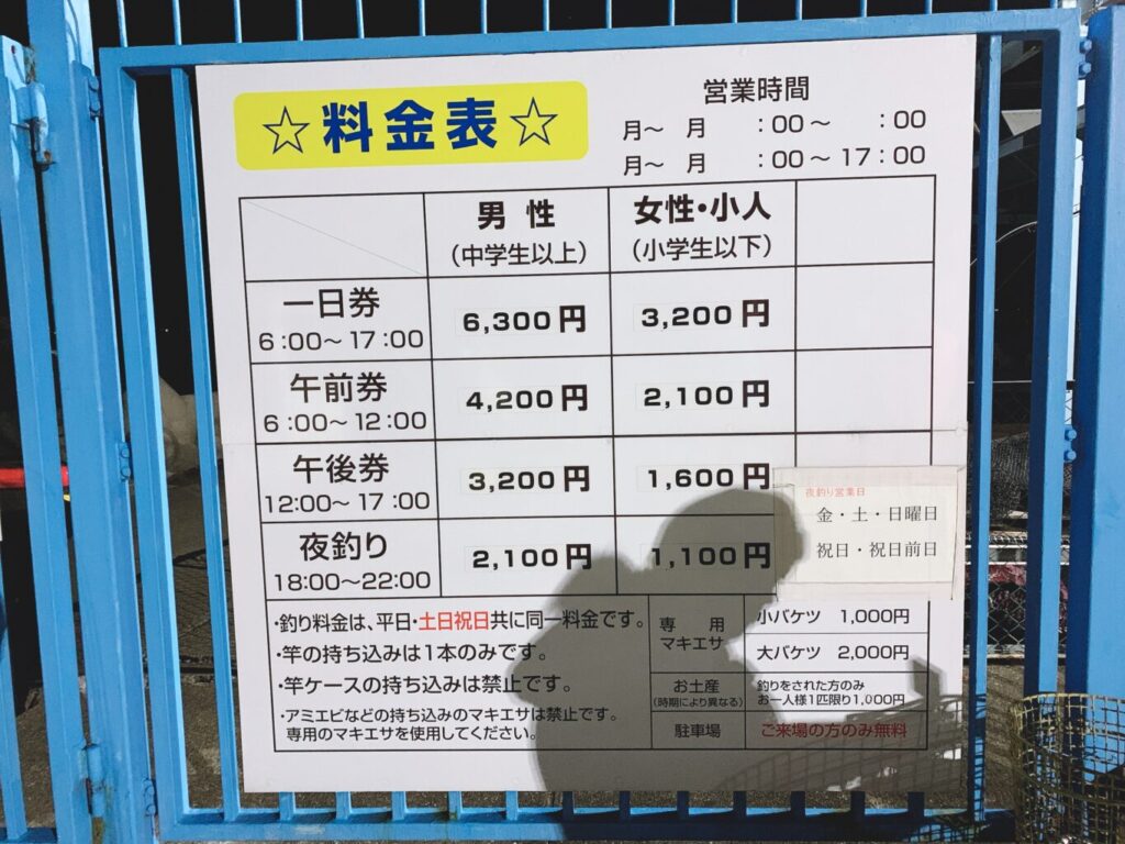 | 料金 | 貸切無し ◉1日券 6:00〜17:00 6,300円 女性小人3,200円 ◉午前券 6:00〜12:00 4,200円 女性小人2,100円 ◉午後券 12:00〜17:00 3,200円 女性小人1,600円 ◉ナイター夜釣り 18:00〜22:00 2,100円 女性小人1,100円 ※ナイター営業は金曜日、土曜日、日曜日、祝日前日、祝日です。 |