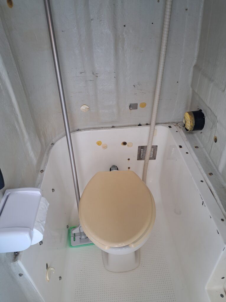 マリントイレ完備。キャビンはエアコンも付いていて快適です。