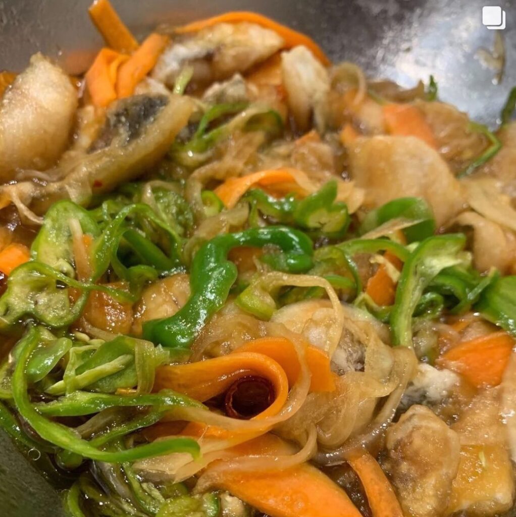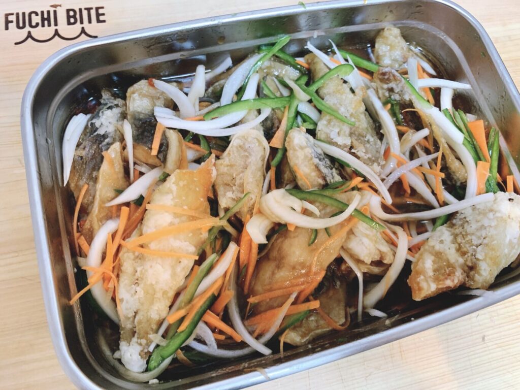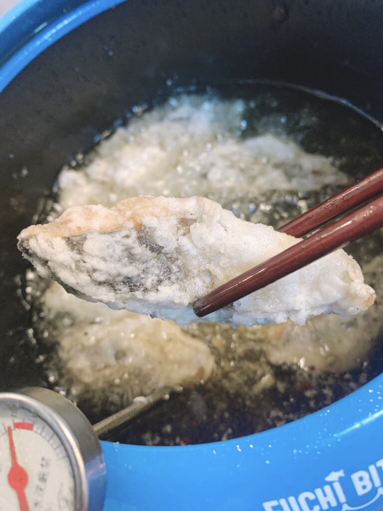 ⑤ ②を180℃の油で3分程揚げ、熱いうちに④の漬け汁に付け、10分程置く。
