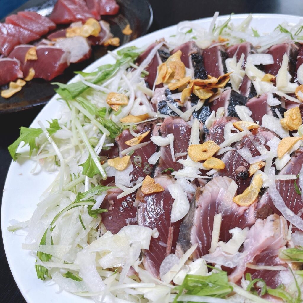 スーパーの鮮魚コーナーにあるカツオのタレに、少しチューブニンニクを混ぜるともっとパンチきいて美味しい♡