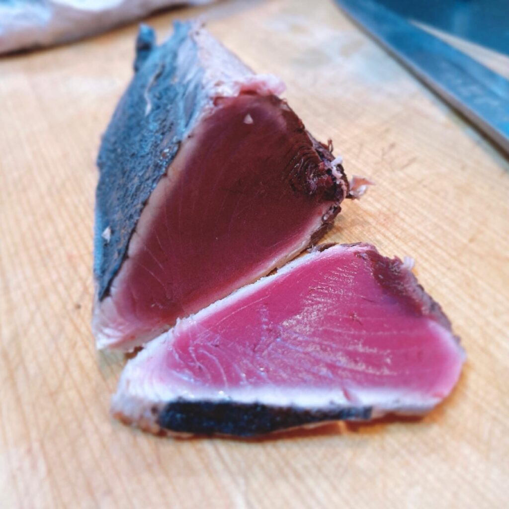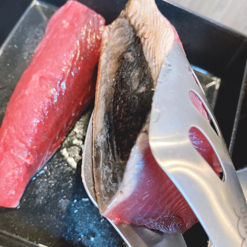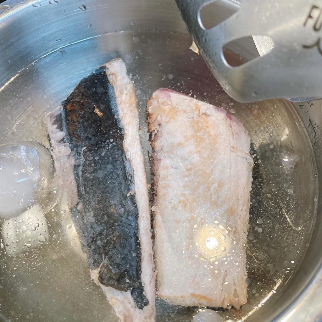 ③そのフライパンにそのままカツオを投入して表面に焼き色が付いたら取り出して氷水に浸ける。