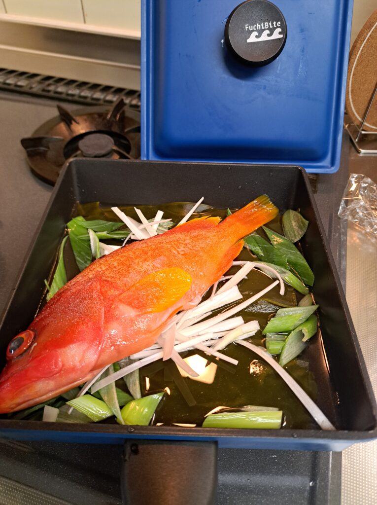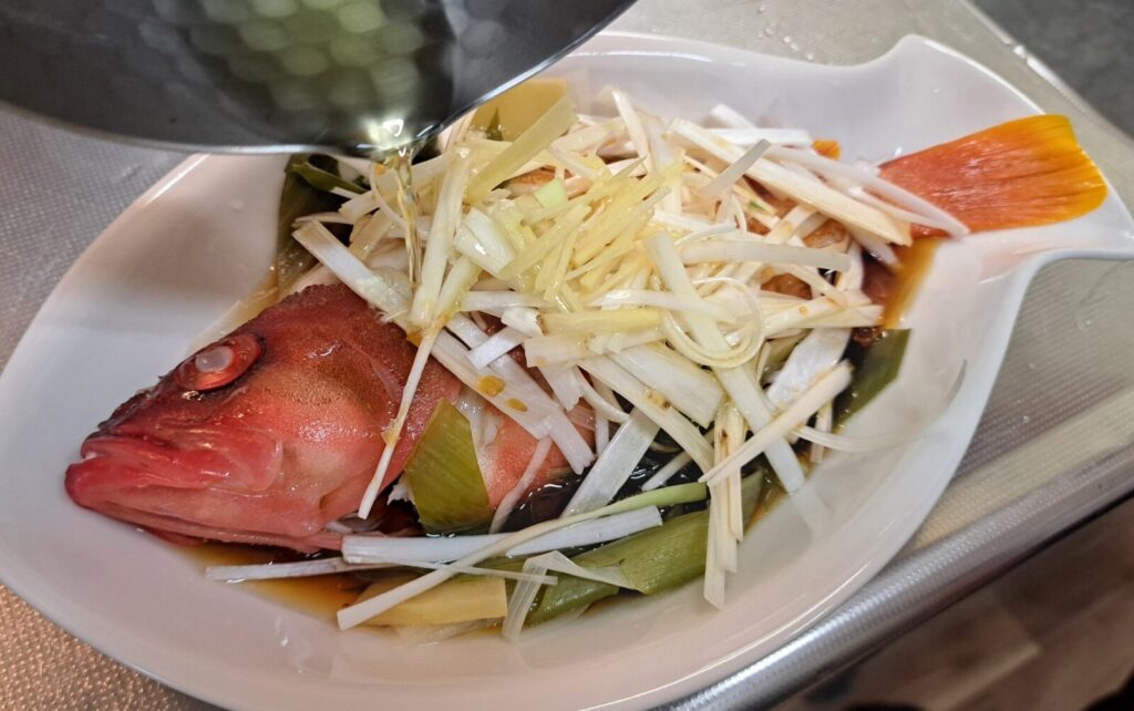 ⑤好みの大きさにカットした長ネギの青い部分と、生姜のスライスをアカハタに添えて、日本酒か紹興酒を全体に150㏄程たっぷりかけ、蓋をして15分程中火で蒸す。