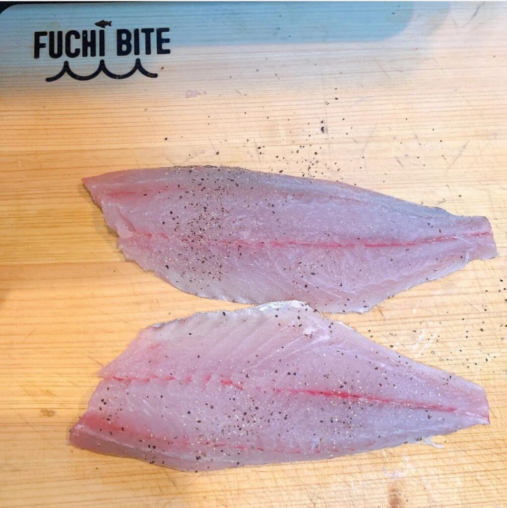 ① イサキの⾝に塩コショウする。