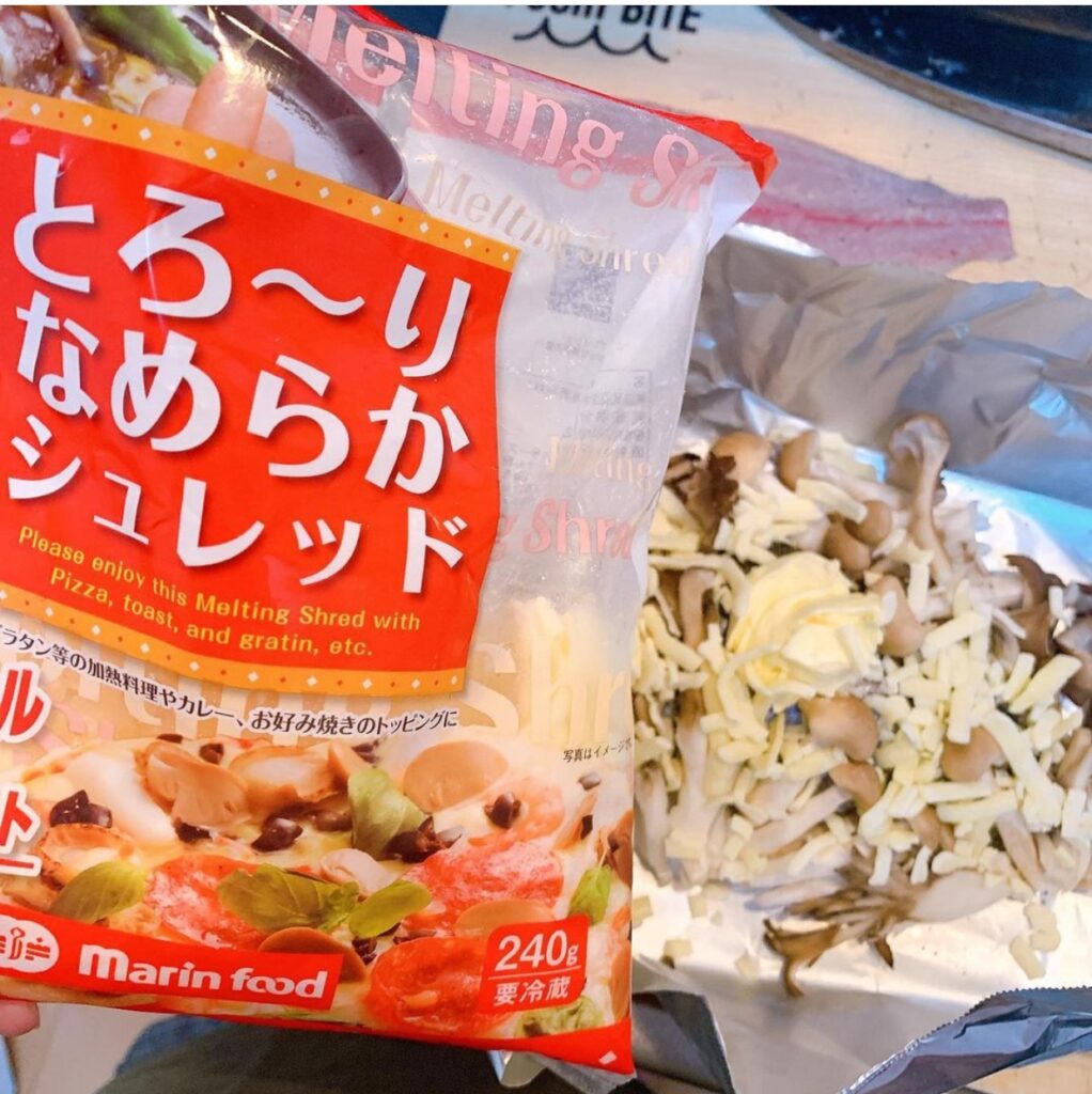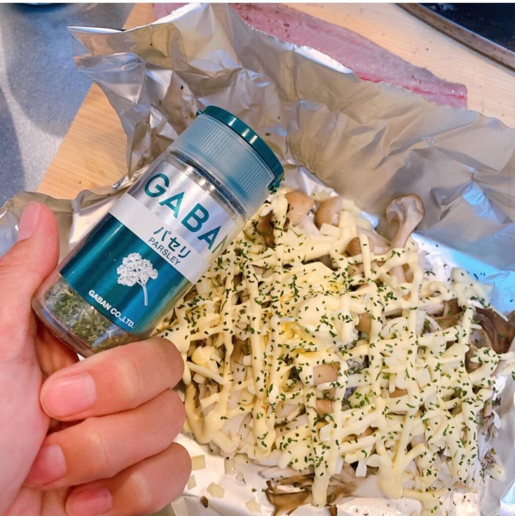 ② アルミホイルに⽟ねぎ、バター、イサキ、キノコ、チーズ、パセリの順で乗せる。
