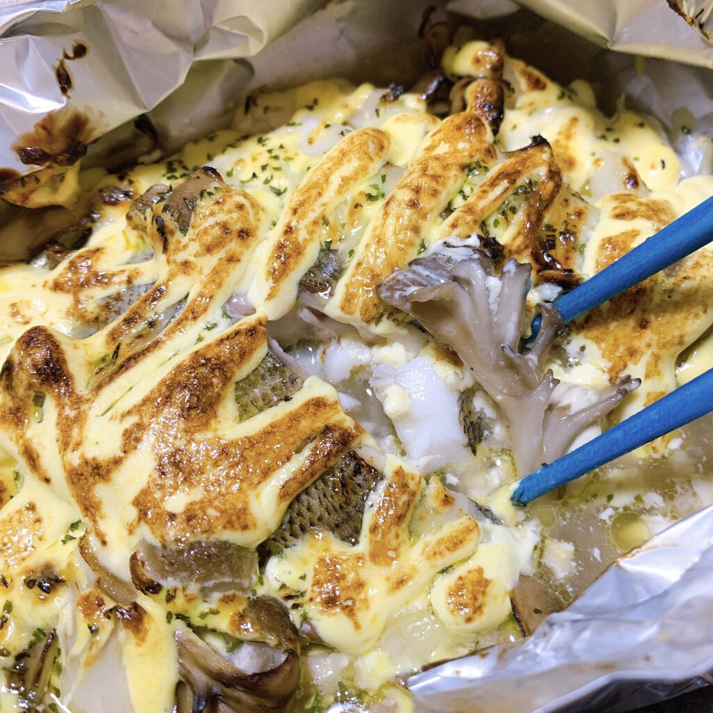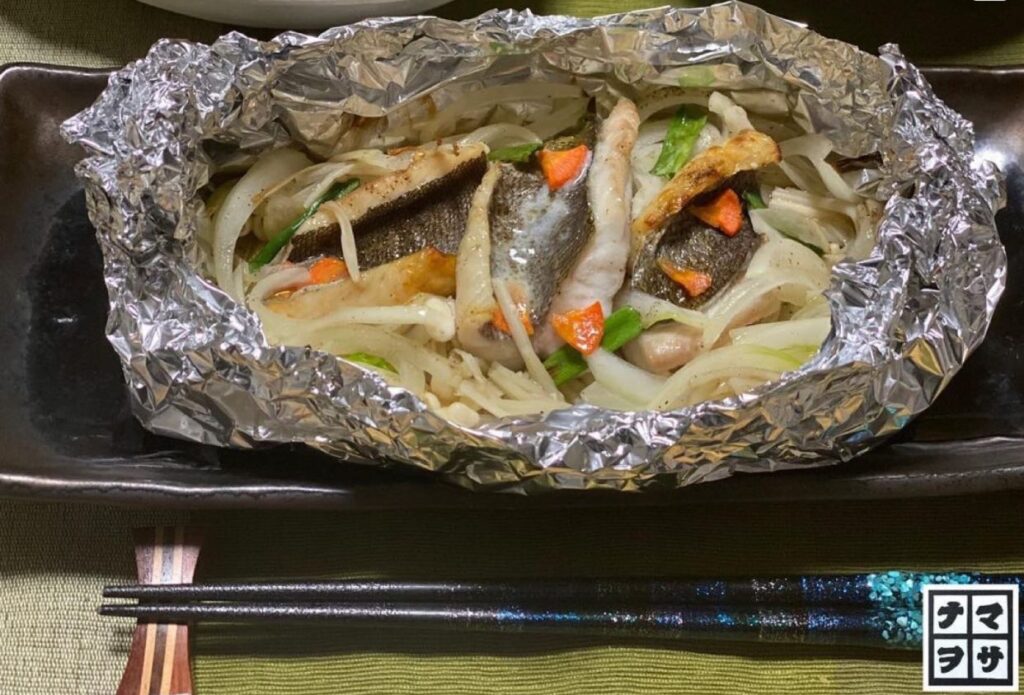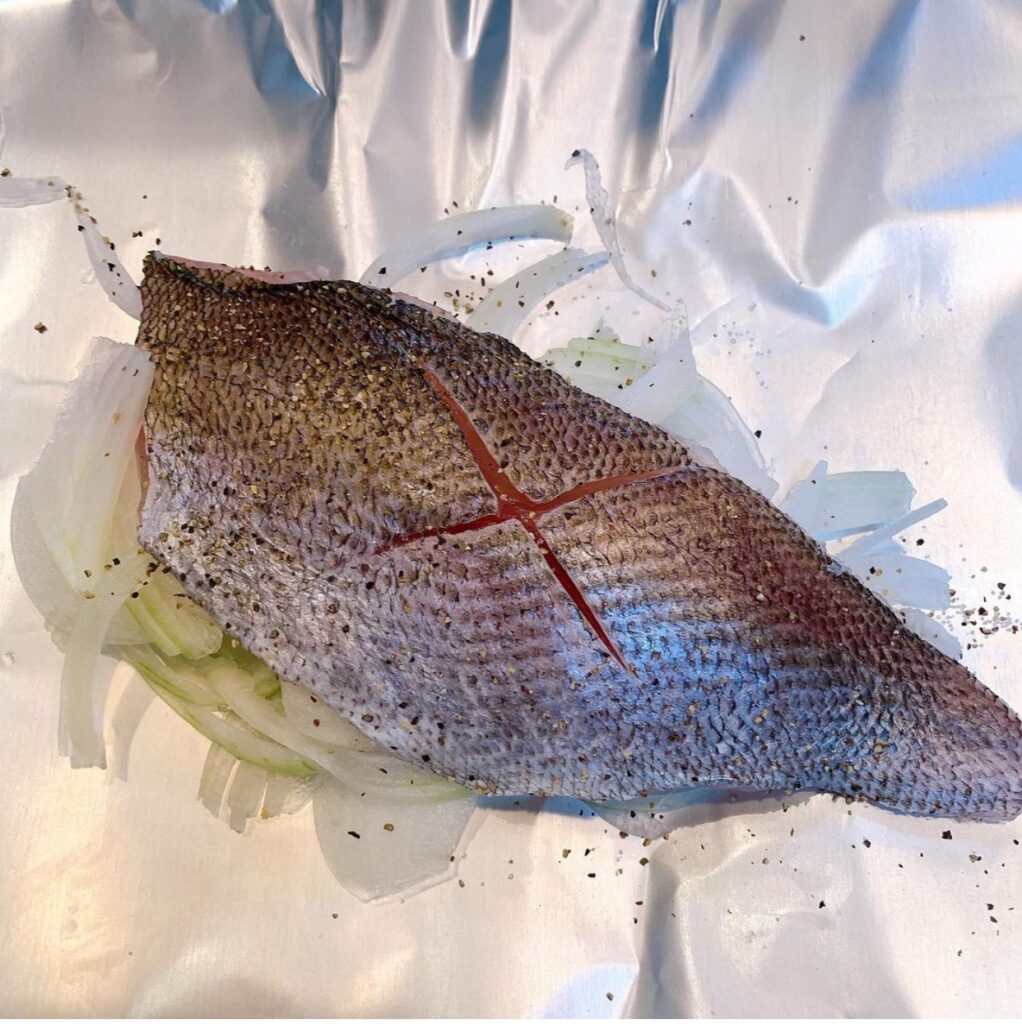 オーブンで焼く時間を短縮するにはあらかじめイサキをフライパンで軽く焼いてもオッケー。ただ、アルミで包んでオーブンでじっくり焼いた⽅が旨味汁が逃げずジューシーな仕上がりになります。