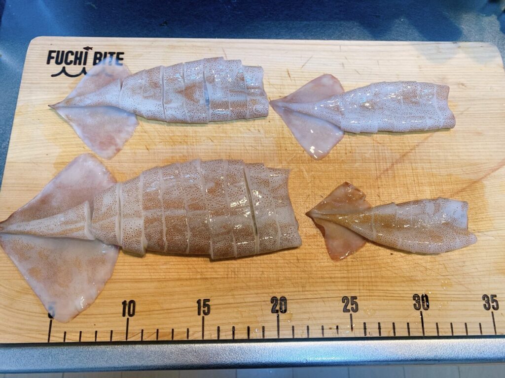 ①スルメイカは中のハラワタを取り片側に切れ目を入れ、ゲソも食べやすいサイズにカットする。