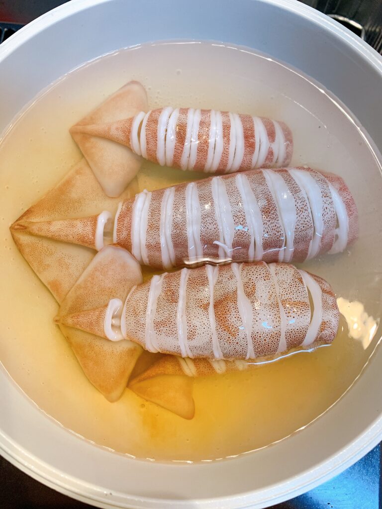 ④めんつゆ、生姜、ニンニクを混ぜてイカにかけるように流し込む。量は味見しながらお好みで。