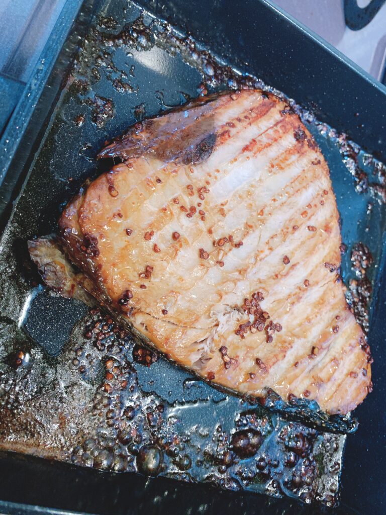 ③フライパンにオリーブオイル、バター、ニンニク、醤油を混ぜて入れ、ソースを作り、オーブンで焼いたマグロとにかけるように和える。