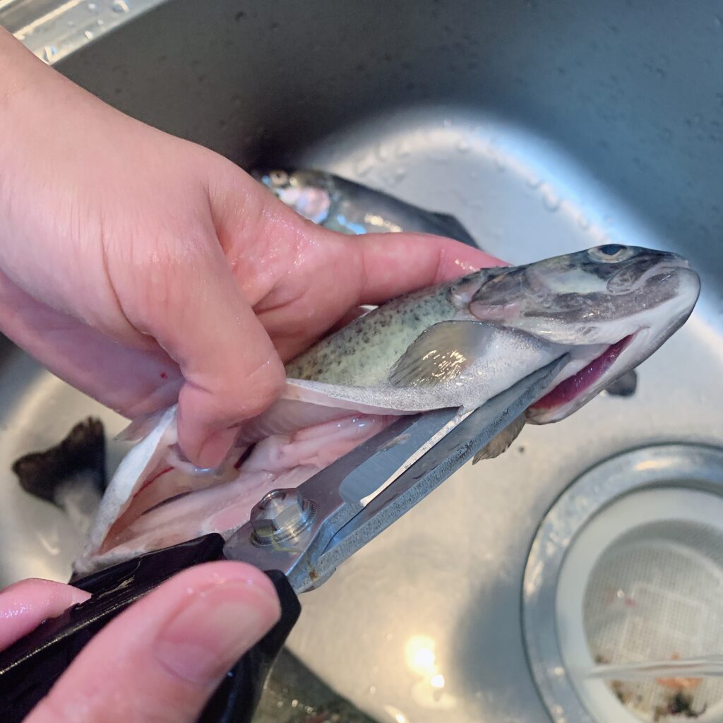 アジ、アユ、ニジマスなどの小~中型魚やイカであれば、包丁とまな板を使わなくてもハラワタ処理が可能です。
