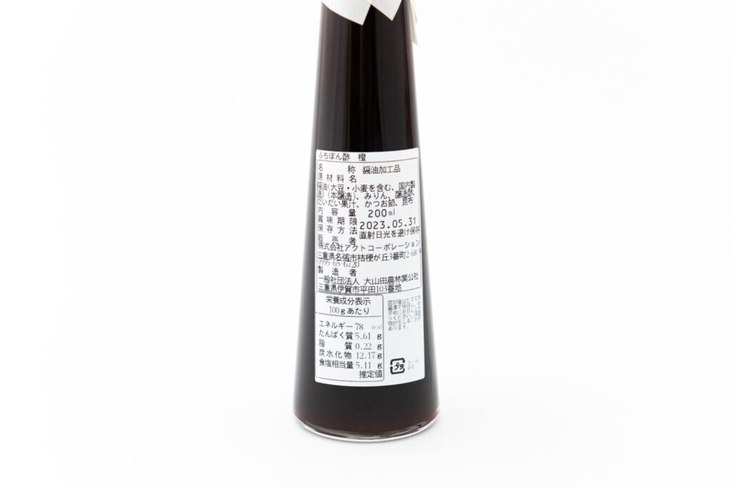 和歌山県有田で製造されている伝統的な醤油とお酢を使用。厳選された国産大豆と小麦を使用し、約2年間かけてじっくり熟成された手造りの味。